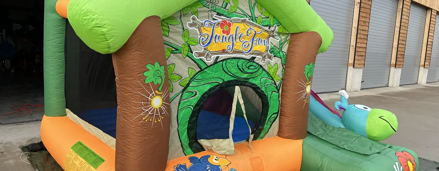 Die Hüpfburg Dino hat eine Grundfläche von 11,9 m² Die Hüpfburg ist rundum (außer vorne beim Rutscheneingang) mit einem Netz bespannt für optimale Sicherheit. Beim seitlichen Eingang ist das Netz überlappt, sodass die hüpfenden Kinder sicher sind, während andere Kinder ein- und aussteigen. Das Besondere an dieser Hüpfburg ist das Dschungeldesign und die lustige Schlange an der Riesenrutsche. Die JDino Hüpfburg ist nicht nur eine einfache Hüpfburg, sie hat außer der Hüpffläche einen Tunnel, eine Kletterwand und die riesige Rutsche.