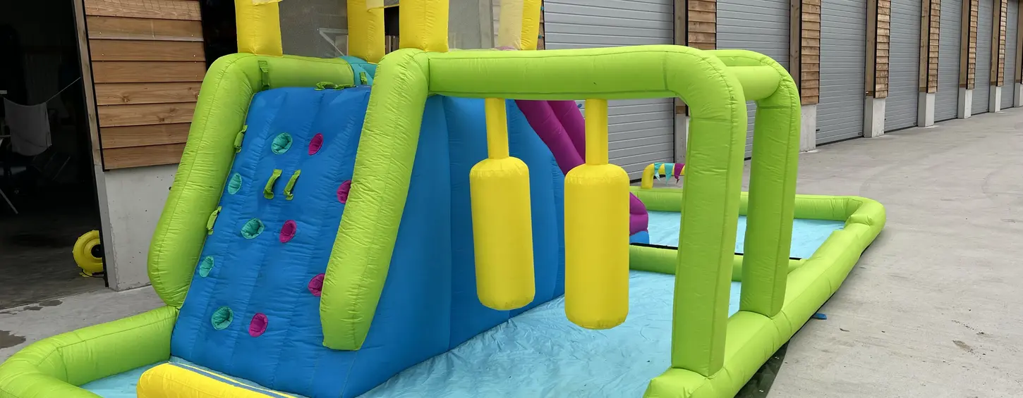 Hier ist Wettrutschen angesagt! Der Mega Wasserpark Splash Course hat extra eine Doppelrutsche, damit um die Wette gerutscht werden kann, Außerdem gibt es einen Hindernisparcours mit Boxsäcken und Sprinklerball des weiteren gibt es noch einen Pool Bereich, eine Kletterwand hoch zur Rutsche... Hier können bis zu 10 Kinder gleichzeitig Spaß haben.